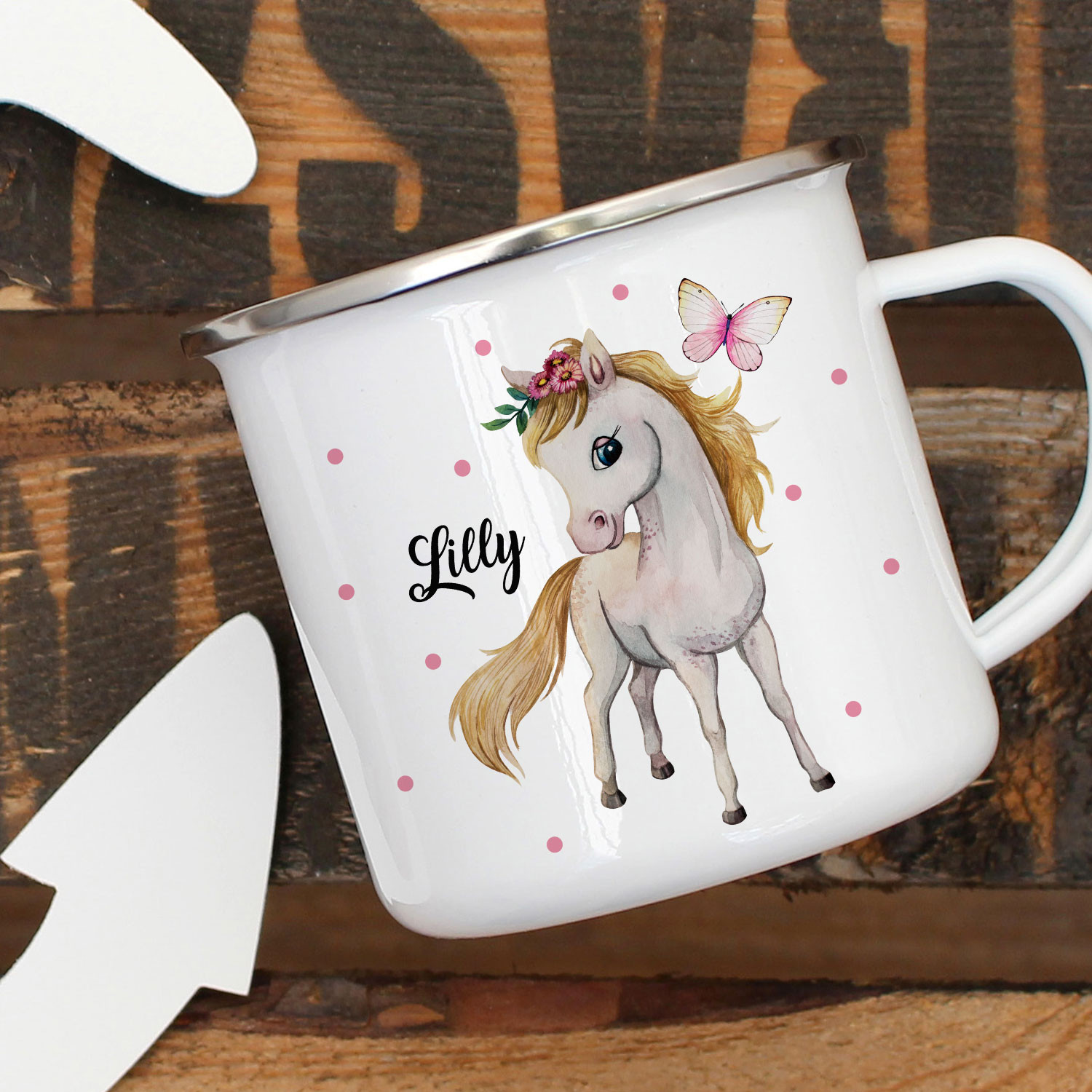 Emaillebecher Becher Tasse Camping Pferd Pferdchen Schmetterling Wunschname Name Kaffeetasse Geschenk Eb390 Wandtattoos Elfentur Tassen
